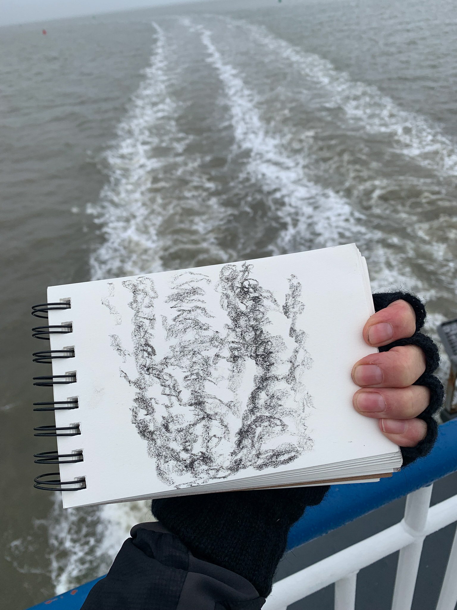 I started on the boat: drawing the dynamics of the water, the movements, the waves. After arriving at Studio Betzy, the former studio of Betzy Akersloot-Berg with a view over the mudflats,