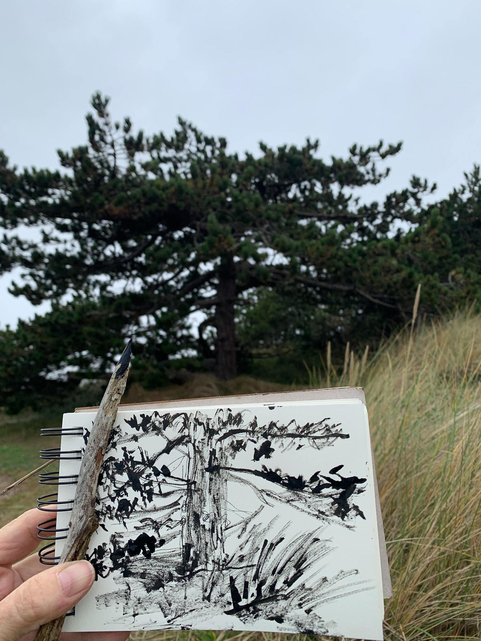 With a folding stool and a backpack full of drawing supplies, I entered the forest around the lighthouse. The crooked pine tree, shaped by the wind and the dune landscape, became my subject. I drew it in all sorts of ways, with different materials, including twigs from the tree itself, dipped in Indian ink. Sheets full of experiments.