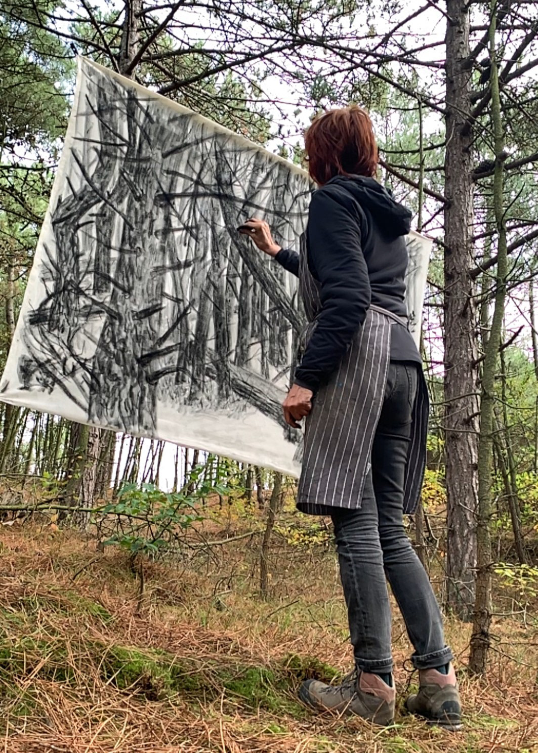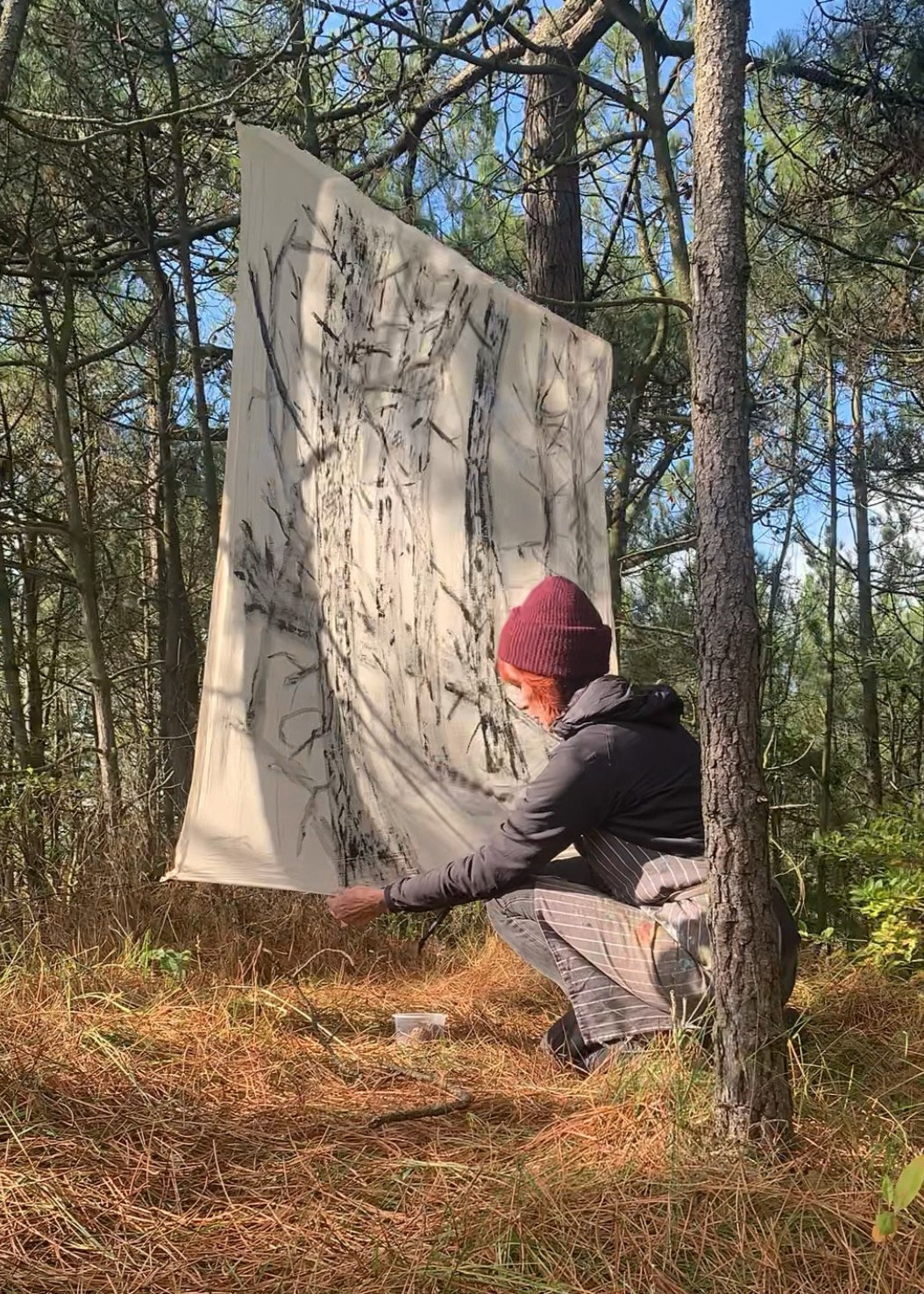 A large piece of fabric stretched between the trees. Charcoal didn't work, so I switched to ink. The forest in 3D around me. I love large-scale work, but I'd never done it outdoors before, and certainly not