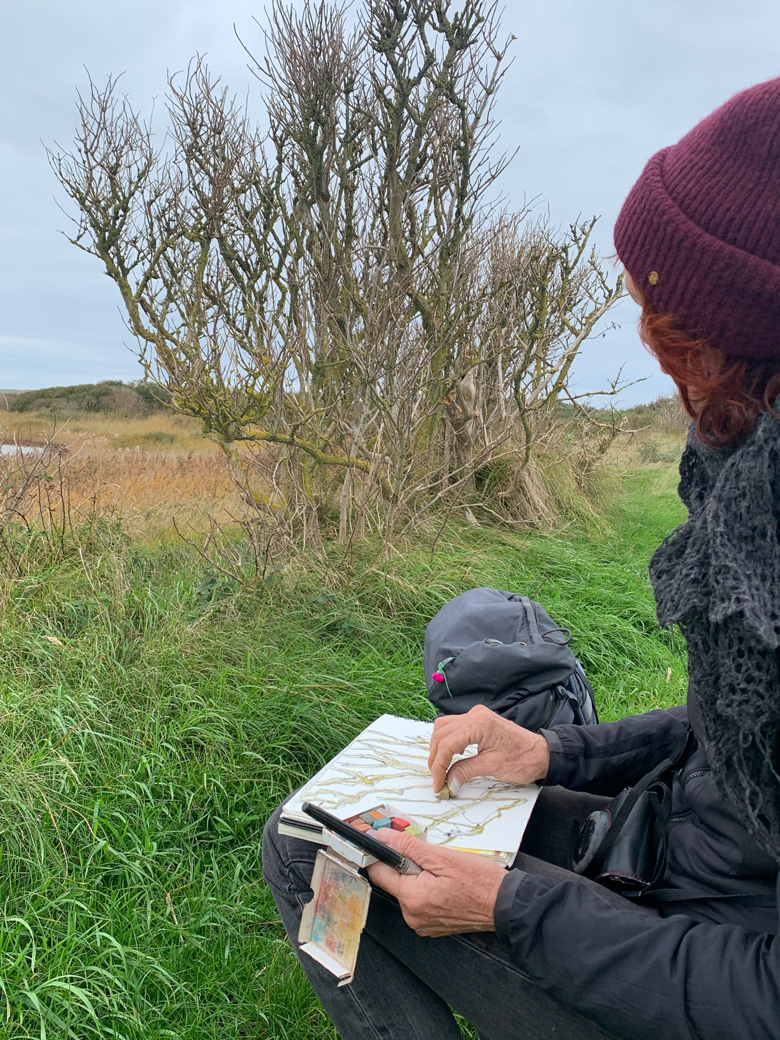 Near the old duck decoy is a beautiful birch grove that has been completely affected by the wind, causing many trees to lean. A wonderful place to draw among the goats.